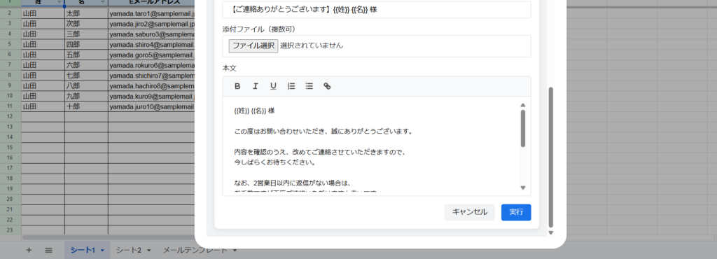 スプレッドシートに記載された氏名やメールアドレスを読み込んで、{{姓}} {{名}} 様 といったパーソナライズ化された内容を個別に送信できるようにしました。※姓名以外も列の名称を元に変換可能です。