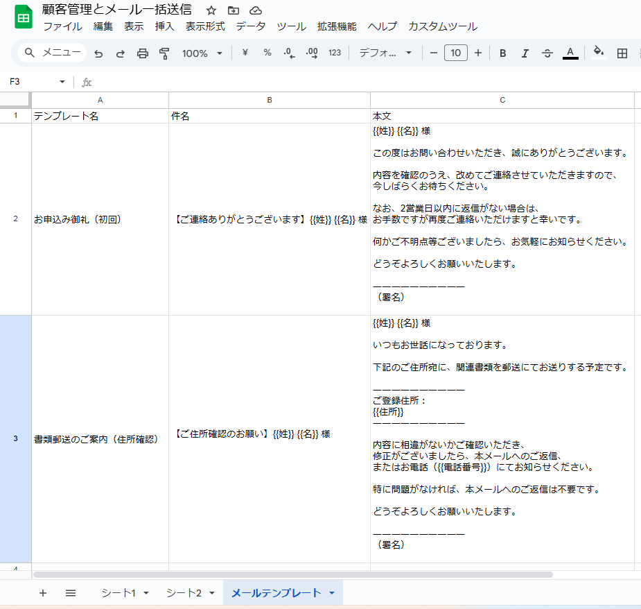 スプレッドシートは、使い方次第では一般的な顧客管理システム以上に柔軟で、全体を把握しやすいという強みがあります。そこにメール一括送信とテンプレート機能を組み合わせれば、月額費用がかかるCRMを無理に導入する必要はないと考えています。